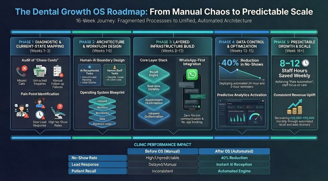 This phase is uncomfortable because it reveals chaos. Most clinics discover that leads are being handled differently depending on who answers the phone. Appointments are being scheduled with inconsistent protocols. Follow-ups are happening based on individual memory, not system trigger. Data is scattered across five systems and none of them talk to each other.