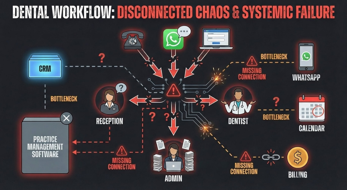 The staff member handling patient communication is exhausted. They're juggling phone calls, WhatsApp messages, appointment booking, no-show tracking, cancellation follow-ups, and data entry into three different systems—because no system talks to another. The owner hires additional staff hoping to reduce chaos. Instead, chaos multiplies because there's no process to coordinate the effort.