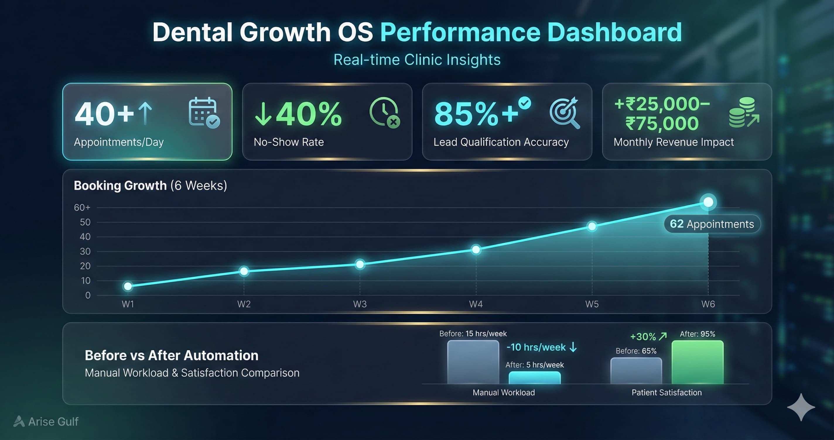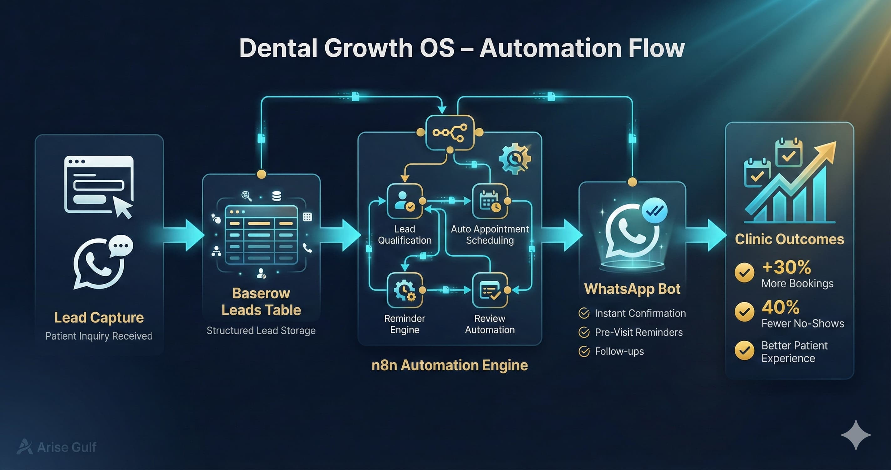 We built Dental Growth OS - an end-to-end automation stack that captures leads from website/WhatsApp, qualifies and schedules them via a WhatsApp bot, automates reminders and follow-ups with n8n workflows, and centralizes data in Baserow for one-click reports.